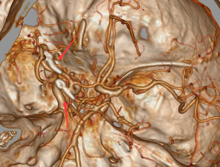 通过脑血管造影检查,罗俊杰在她颅内血管交叉处,发现2枚仅1毫米的微小动脉瘤,科室讨论后认为,后交通动脉瘤出血可能性极大,若短期内再次出血将直接威胁患者生命。