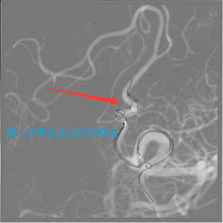 术中第一次微导管顺利到位后,释放支架时因血管迂曲,系统支撑不足,微导管滑落。