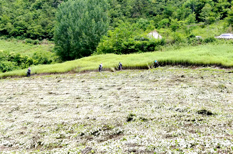 石匠冤死,苍天动容,石匠化成了掉石岩。日前我等一行到宝堂寺,七星沟村书记刘金山派他弟弟刘金银作向导。我们从宝堂寺广场出发,穿过几户人家,沿着弯弯曲曲的山路,向掉石岩进发。这里过去曾有一个生产小队,因不通公路,都搬出去了。这条路是七星沟至万峪河老人坪的必经之路,以前是条大路,现在基本没人走了。沿途茂林修竹,水流潺潺。我们沿峡沟前行,约两公里左右,向导说掉石岩到了。