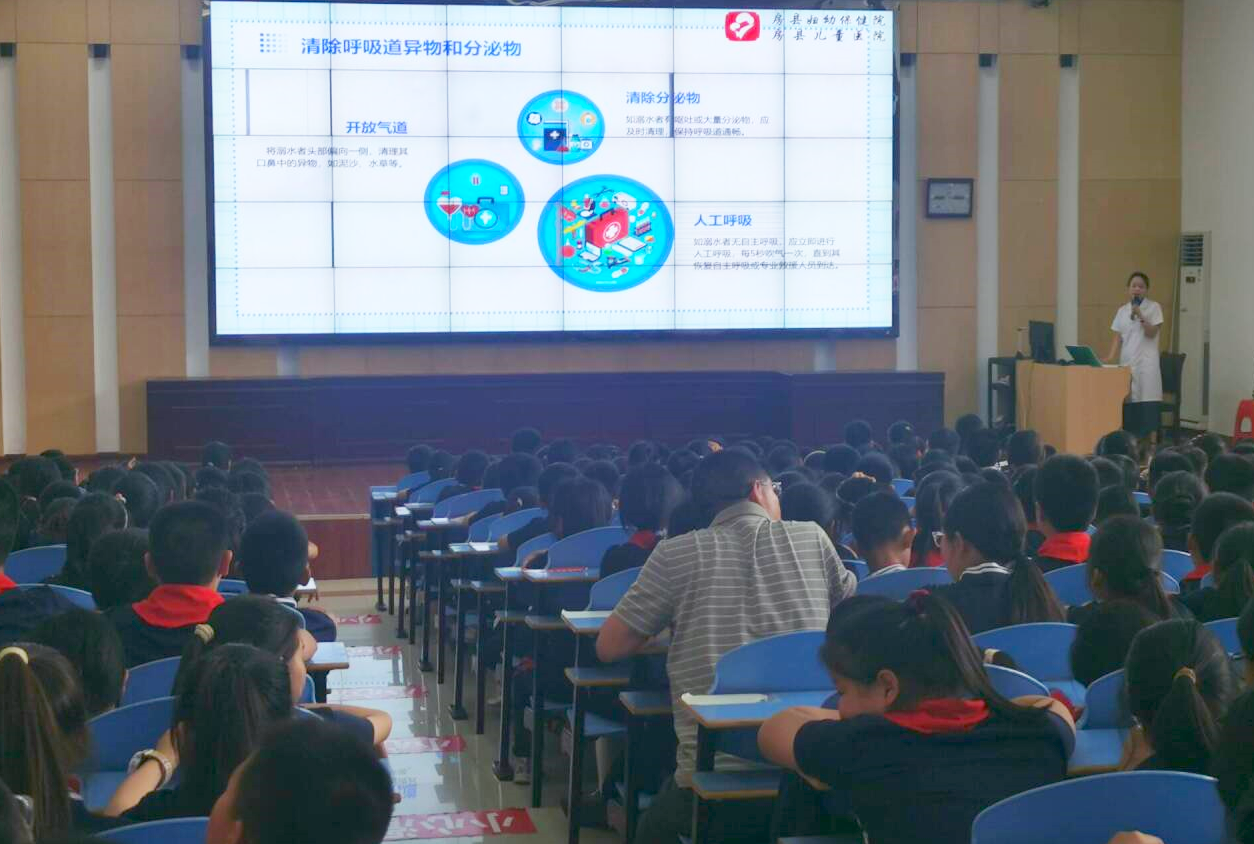 讲座现场,医务人员向师生们详细讲解了溺水自救、如何正确施救、岸上救护的原则和方法,普及了“第一目击者”、“黄金四分钟”等应急救护概念。利用人体模型完整演示人工徒手心肺复苏术的步骤和要领,邀请师生代表现场演练每一个步骤,手把手指导如何选择施救场地、判断呼吸、调整体位、开放气道、循环胸外按压等,让大家详细掌握人工徒手心肺复苏术的操作技能。