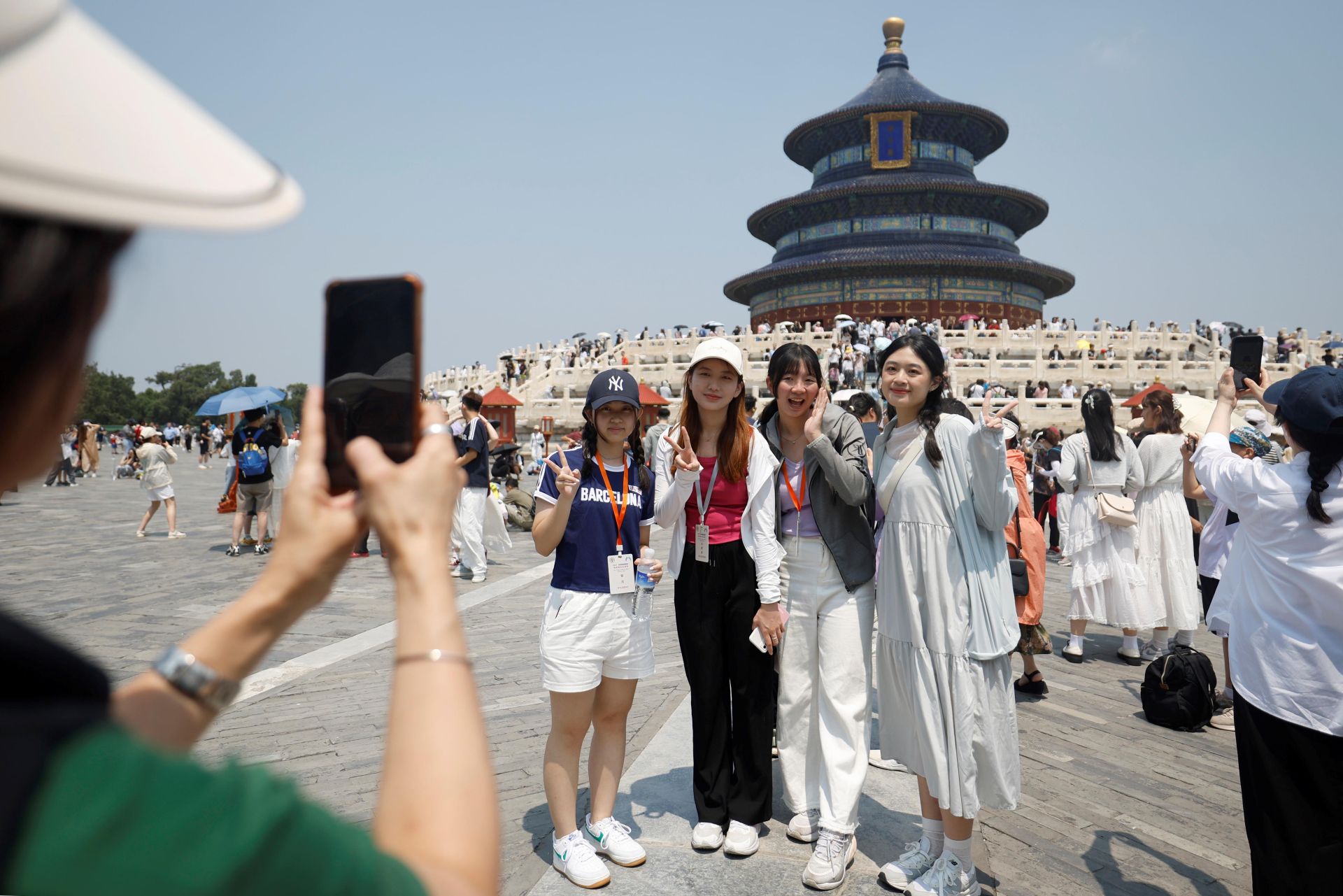 △2024年7月3日,台湾青年在天坛公园拍照留念。当日,2024“未来能源领袖”两岸青年交流营的营员参观游览北京的奥林匹克公园、天坛公园等地。