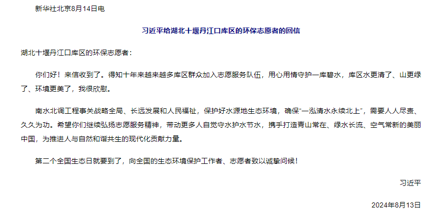 习近平给湖北十堰丹江口库区的环保志愿者的回信