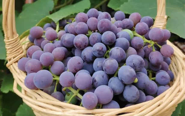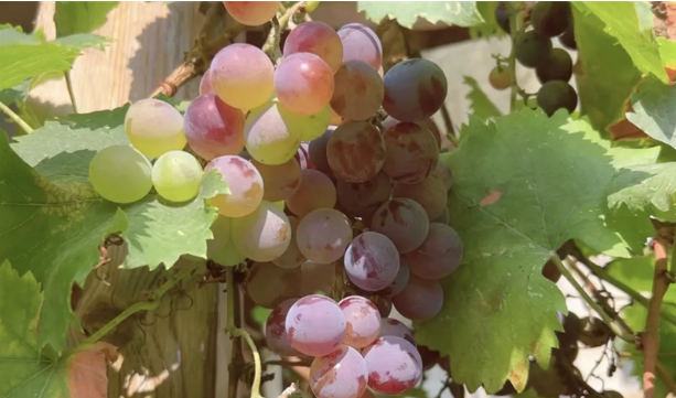 一串串饱满多汁、或绿或紫的葡萄挂满枝藤,掩映在绿色藤叶下,甚是好看,令人垂涎欲滴。