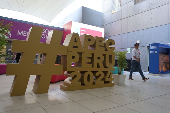 这是11月8日在秘鲁利马拍摄的2024年亚太经济合作组织(APEC)会议标识。新华社记者 许睿 摄