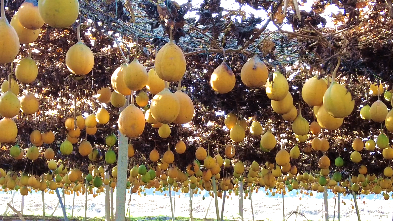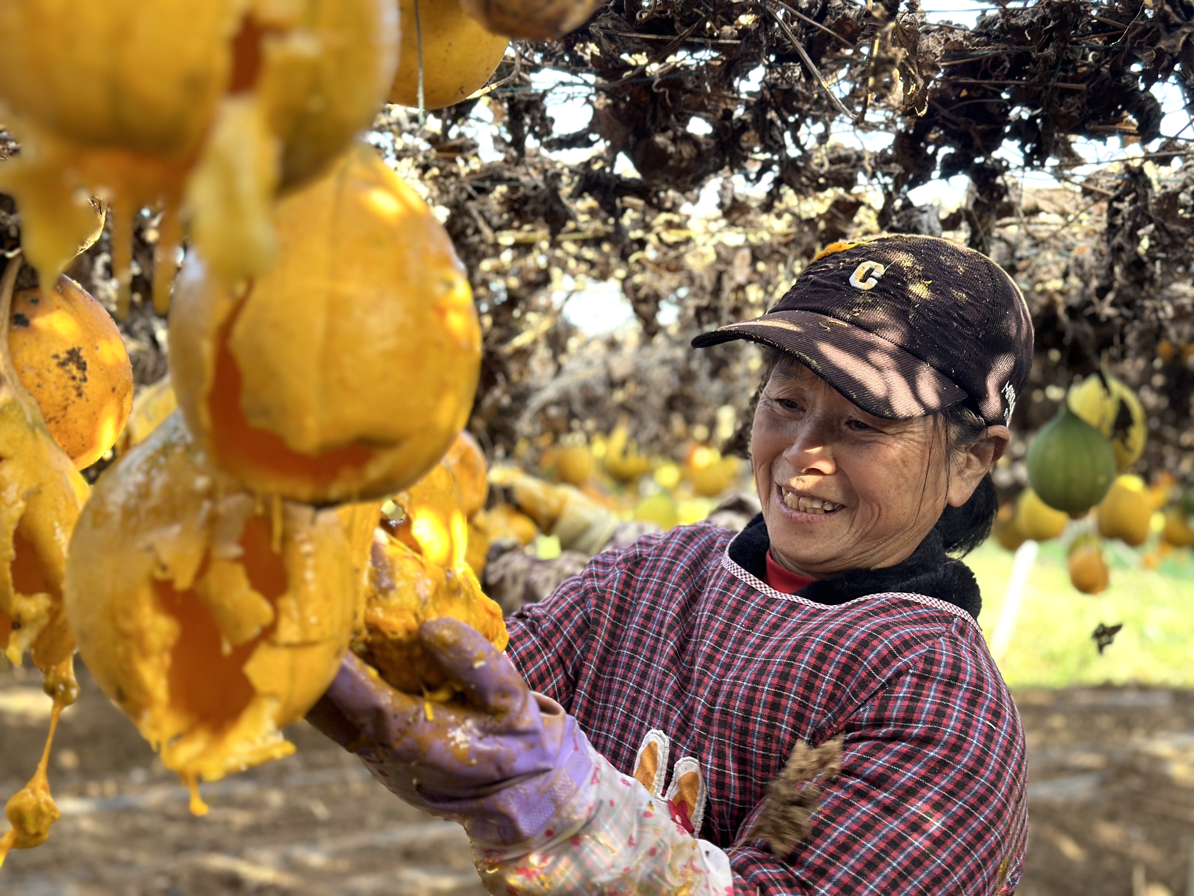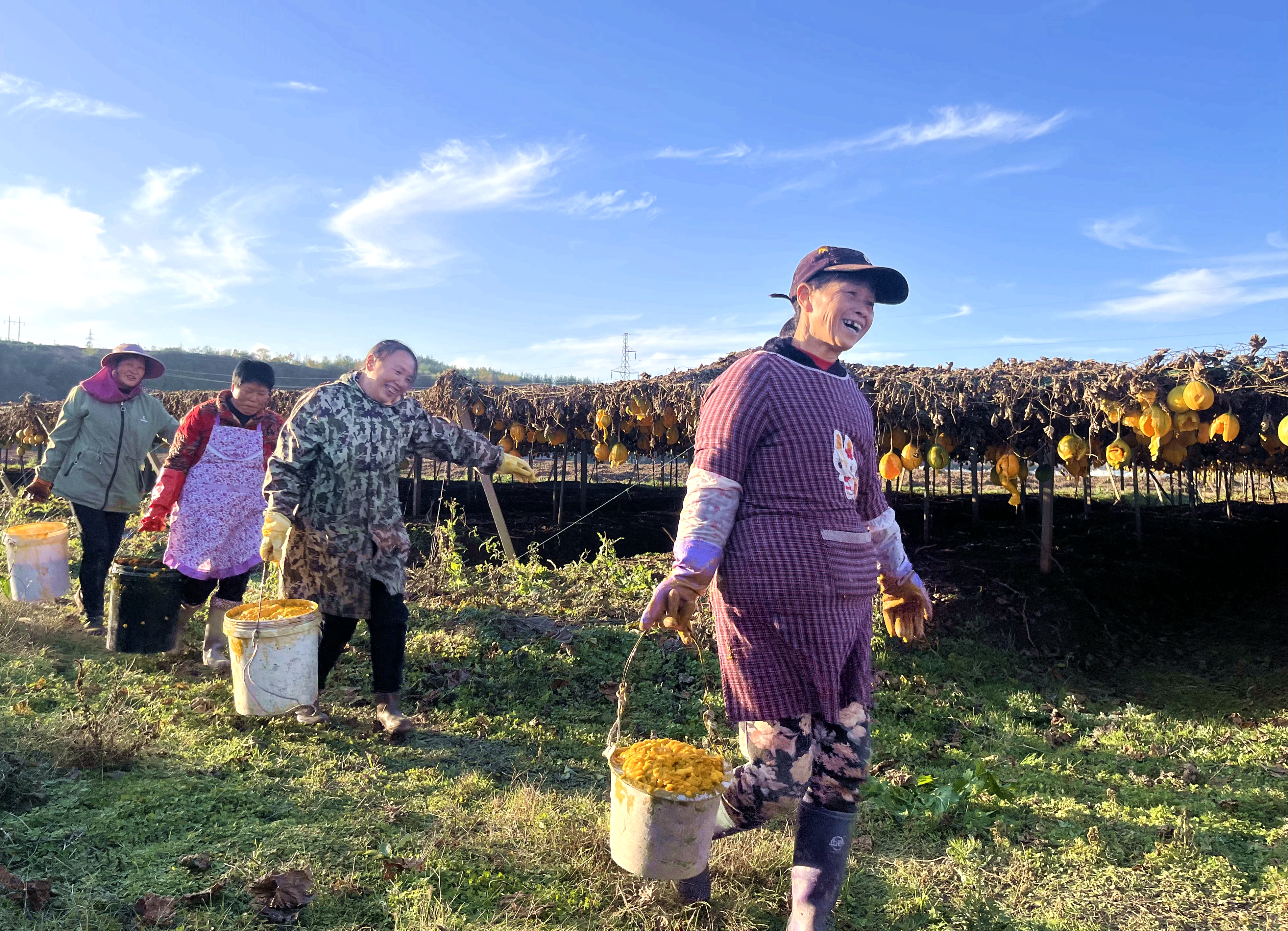 步入吊瓜种植基地,放眼望去,藤蔓纵横交织,橙的、黄的、绿的吊瓜有序错落地悬挂在瓜藤上。瓜棚之下,村民们手提桶、肩挑篓筐在其间来回穿梭,忙着处理成熟的吊瓜,现场处处洋溢着丰收的喜悦。