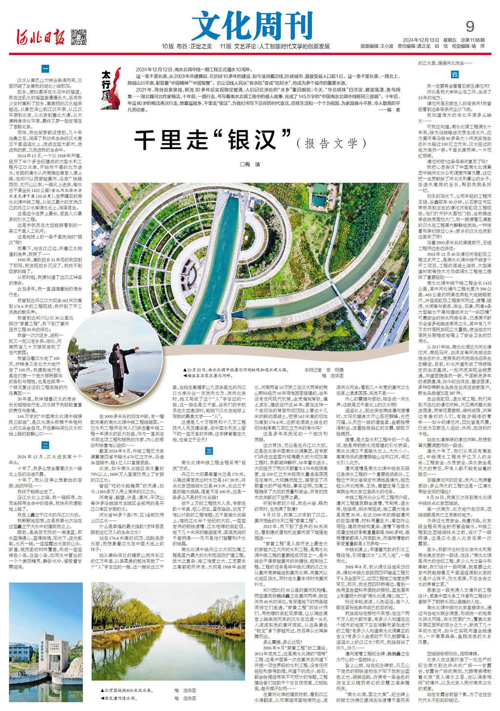 2021年,邢台百泉泉域,断流30多年后实现稳定复涌,人们记忆深处的“水乡”重回眼前;今天,“华北明珠”白洋淀,碧波荡漾,鱼鸟翔集……湖北籍河北作家梅洁,十年前,一路行走、书写着南水北调工程中的感人故事,完成了145万字的“中国南水北调中线移民三部曲”。十年后,年近80岁的梅洁再次行走,她重返故乡,千里走“银汉”,为我们书写下沿岸的时代变迁、百姓生活和一个个为祖国、为家园奋斗不息、令人敬佩的平凡劳动者。