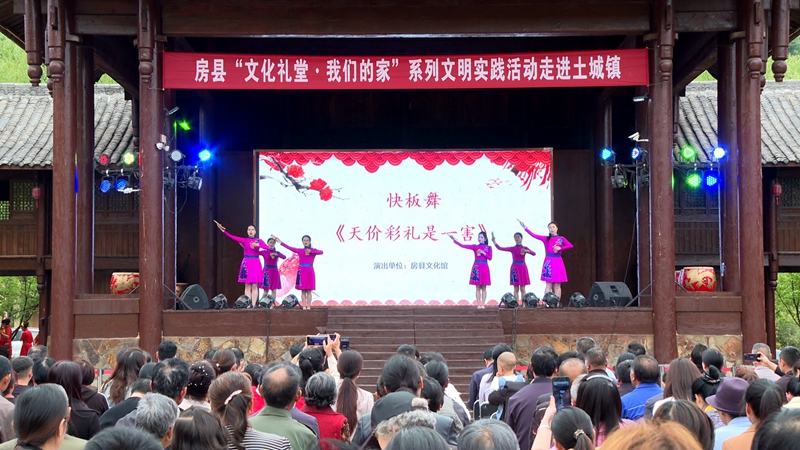 自房县建设文化礼堂,开展文明实践活动进基层以来,各种文明典型不断涌现,文化文艺活动层出不穷,为村民带来家门口的文化大餐。活动中,《诗酒远方》《幸福中国一起走》等文艺节目,将极具特色的《诗经》黄酒文化与田园风光深度融合,快板舞《天价彩礼是一害》赢得了阵阵掌声。土城镇土城村党支部书记耿吉奎描绘了土城村的规划发展前景,道出了每一个村民的期盼。