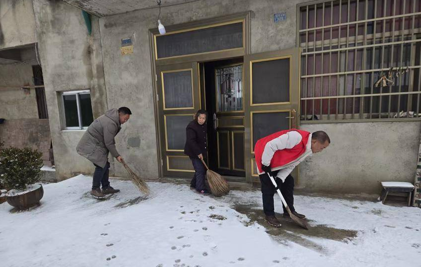 在辖区五组走访时,工作人员发现老党员张大爷家门前积雪深厚,部分路面已凝结成冰。今年78岁的张大爷党龄已有50年,因残疾行动不便,子女又常年在外,面对积雪束手无策。社区人员见状立刻上前安抚:“张大爷,您别急,这雪我们帮您清!”随即从社区便民服务点取来铁锹、扫帚等工具,迅速展开清扫。