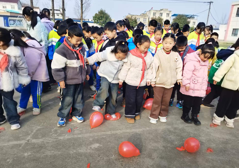 随后进行的“踩爆压力气球”环节将活动推向高潮。同学们在老师的带领下来到操场,手持彩色气球,将内心的焦虑与压力写在气球上,并随着呼吸缓缓吹气。气球不断膨胀,负面情绪仿佛被具象化封存。最后,伴着一声令下,孩子们用力踩爆手中代表“负面情绪”的气球。清脆的爆破声、跳跃的身影和抑制不住的笑声瞬间点燃整个操场。“把不开心的都踩走,新学期我要装满开心和能量!”二年级学生李云泽一边蹦跳一边挥着手大声喊道,眼里闪着光。