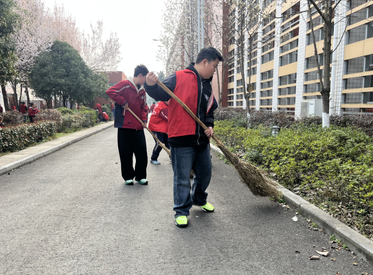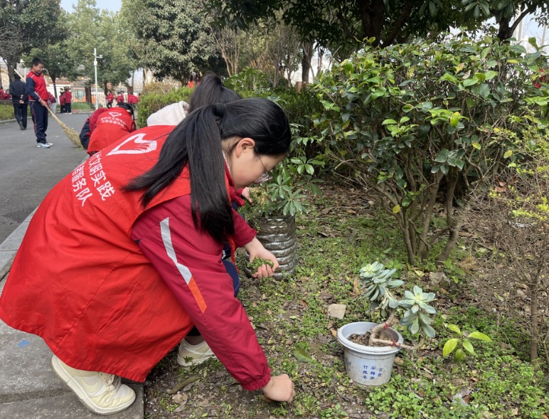 3月12日植树节当天,学校组织师生集中开展校园绿化带维护专项行动。在老师的带领下,学生们化身小小志愿者,对校园绿化带、花坛、树木进行全面养护,大家分工协作,认真捡拾落叶垃圾、擦拭花坛护栏、为绿植浇水除草、修剪枯枝杂草,用实际行动守护校园绿色家园。俯身劳作的红色身影,与生机勃勃的生态绿相互映衬,成为校园里最亮丽的风景线。