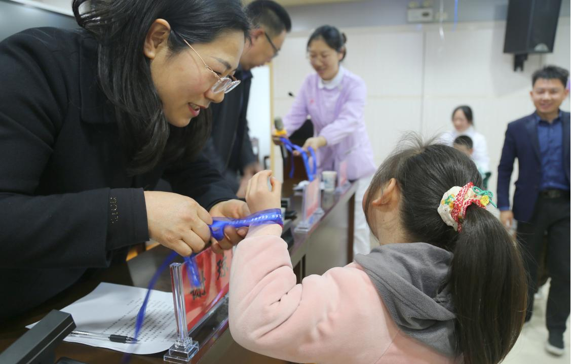 在蓝丝带祈福仪式上,与会领导与康复治疗师为每位孩子系上象征希望与接纳的蓝丝带,现场温情涌动。随后,在治疗师带领下,全体人员共跳《身体音阶歌》手指操,轻松欢快的节奏为亲子游戏环节预热。