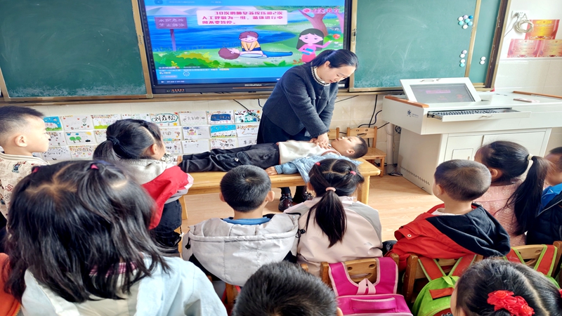 演练前,各班教师结合幼儿年龄特点,开展了防溺水安全教育活动,向幼儿讲解了溺水的危害、溺水症状、自救与救护知识,重点教授溺水时的自救方法、抽筋应急处理及岸上急救流程,让幼儿对防溺水安全知识有全面的认识。演练中,教师模拟幼儿在河边玩耍不慎落水的场景,引导其他幼儿第一时间报告老师。教师接到报告后,立即判断现场情况,优先采用抛掷救生圈、竹竿拉拽等岸上救援方式,对“落水幼儿”开展救助。随后,教师按照急救流程,对“溺水幼儿”进行清除口鼻杂物、控水、人工呼吸及胸外心脏按压等急救操作,整个过程紧张有序,师幼配合默契。