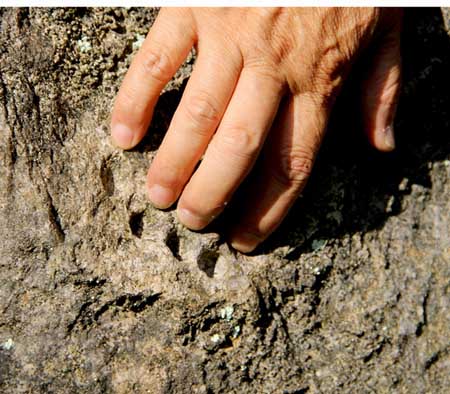 “四指山”位于尹吉甫镇榔口村保林,此山系喀斯特地貌,山上分布有6个溶洞竖井,深不见底,整座大山多有奇峰异石,风景秀丽。 “四指山”名称源于留在山石上的四个手指印,相传真武大帝修仙得道后,坐在此山休息一晚,第二天却发现此山下陷三尺三寸,于是就用手将山体托起恢复原状。因用力过大,在山石上留下了真武大帝四个手指印记。(刘中华 周开华 摄)