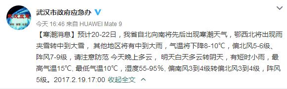 湖北日报新闻客户端报道:19日下午,武汉市政府应急办发布寒潮消息。消息指出,湖北将遭遇寒潮天气,需谨防大风降温和冰冻灾害。